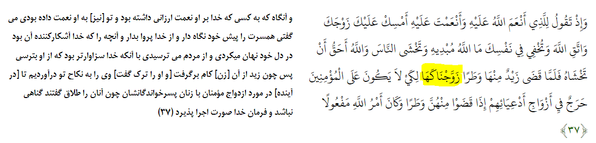5. زینب دخترعمه پیامبر و از خاندانی ثروتمند و سابقا مسیحی بنی اسد بود. پیامبر برای خواستگاری برای زید نزد آنها رفت ولی آنها مخالفت کردند. لذا الله با نزول آیه 36 سوره احزاب به زینب تشر زد که نافرمانی نکند. زینب گرچه فرمان الله را اطاعت کرد ولی هیچگاه به زید روی خوش نشان نداد.