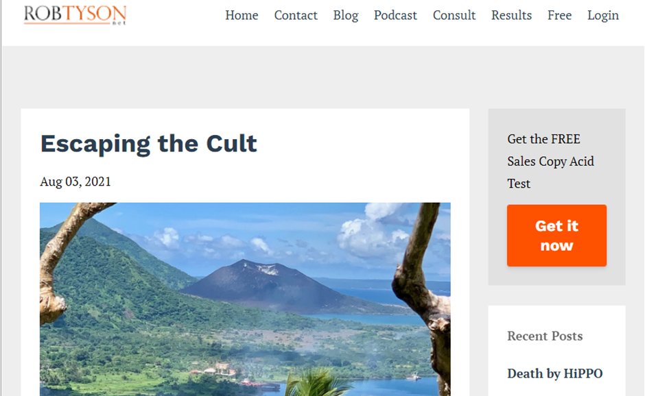 7) Rob Tyson, who works in marketing & sales, unironically has a blog piece on his website titled "Escaping the Cult".