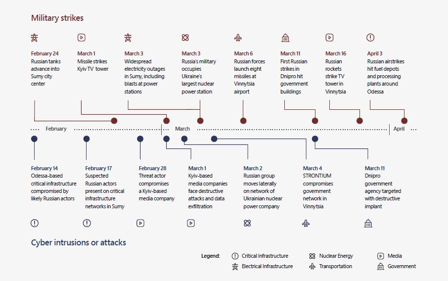 [6/16] Microsoft tente une superposition chronologique des ops cinétiques et cybernétiques, pour évaluer l'hypothèse d'une coordination/synchronisation des 2 domaines. Je ne trouve pas que les éléments soient probants à ce stade mais l'exercice reste intéressant et nécessaire.