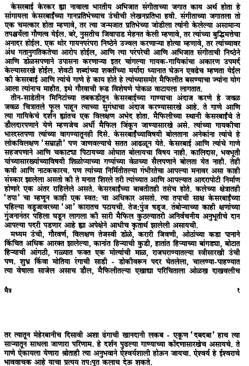 पण इथं एक लक्षात घ्या. केसरबाईंचा हा दरारा फक्त आणि फक्त एकाच कारणामुळे. ते म्हणजे- त्यांच्या कलेशी असलेल्या प्रामाणिकपणामुळे आणि कलेसाठी आयुष्य अर्पण केल्यामुळे. पुल देशपांडे केसरबाईंविषयी अतिशय विनम्रपणे कोणत्या शब्दांत व्यक्त होतात, हे वाचण्यासारखं आहे!