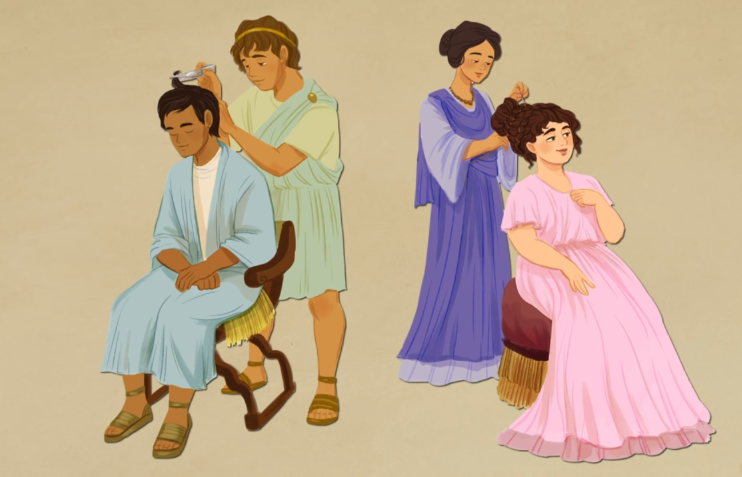 El cabello estaba recogido con cintas y dividido en seis crines, separadas por una punta de lanza arrancada del cuerpo de un gladiador muerto.
