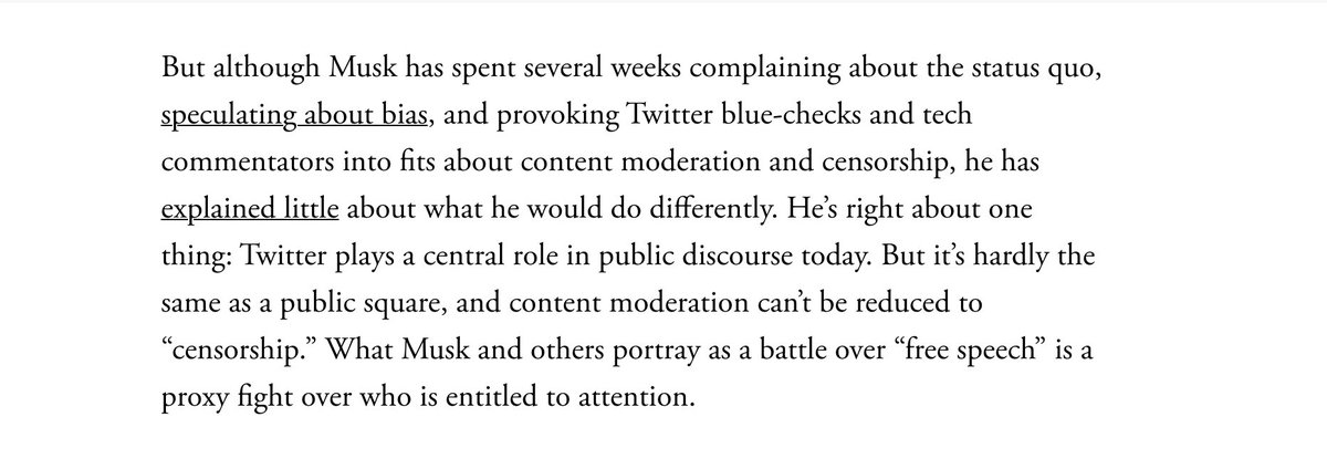 Now that Twitter has been 'liberated' (somewhat) I'm starting to realize that the elite conception of 'free speech' has been utterly warped by the past few years of 'content moderation,' plus an American journalist tradition of (nominal) viewpoint neutrality and both-sides-ism.