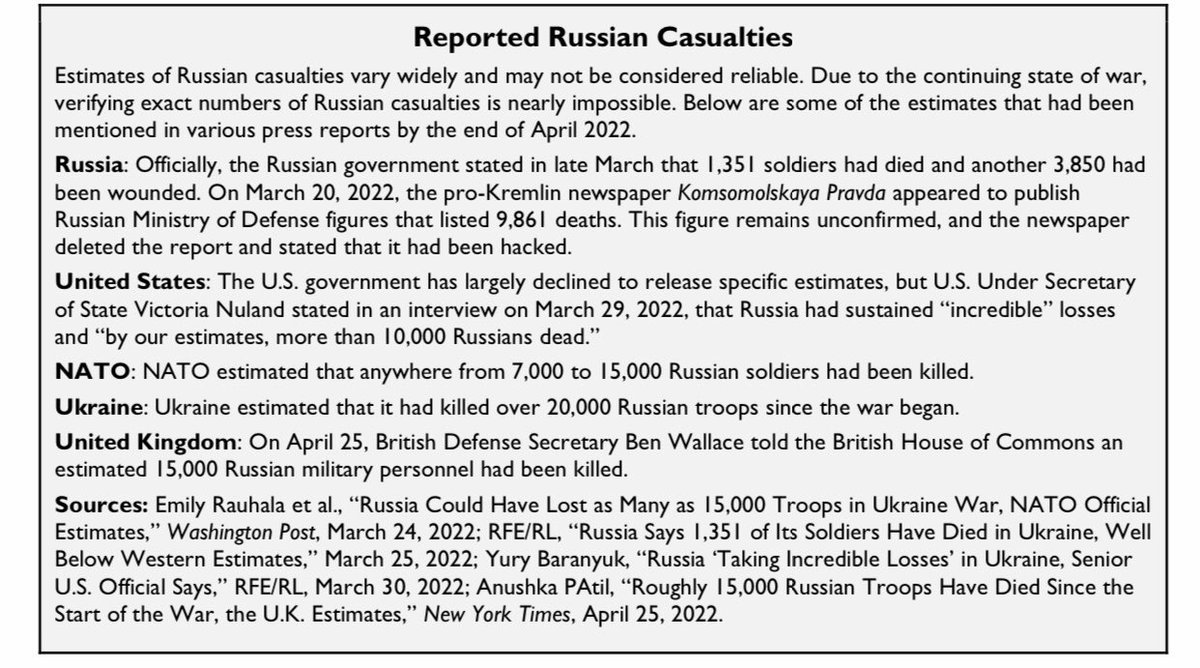 Here is a helpful summary of key estimates of Russian losses. My threads have collected these reports as they were made, but this is a concise summary. From the US Congressional report