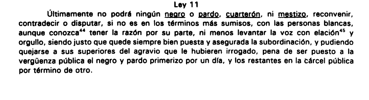 «No podrá ningún negro o pardo, cuarterón, ni mestizo, reconvenir, contradecir o disputar, si no es en los términos más sumisos, con las personas blancas, aunque conozca tener la razón por su parte, ni menos levantar la voz...».