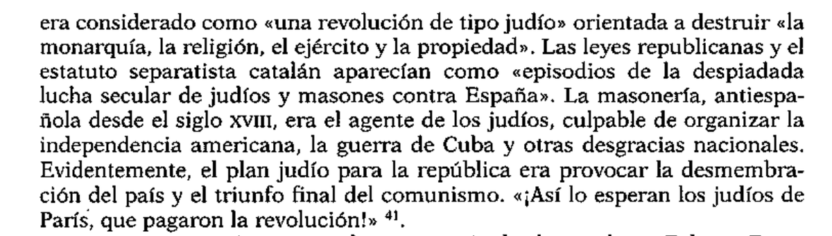 los ideales del movimiento hitleriano: «raza», «imperio» y «antijudaísmo», añadiendo también la «antimasonería» (...) La masonería, antiespañola desde el siglo XVIII, era el agente de los judíos, culpable de organizar la independencia americana, la guerra de Cuba y otras...».