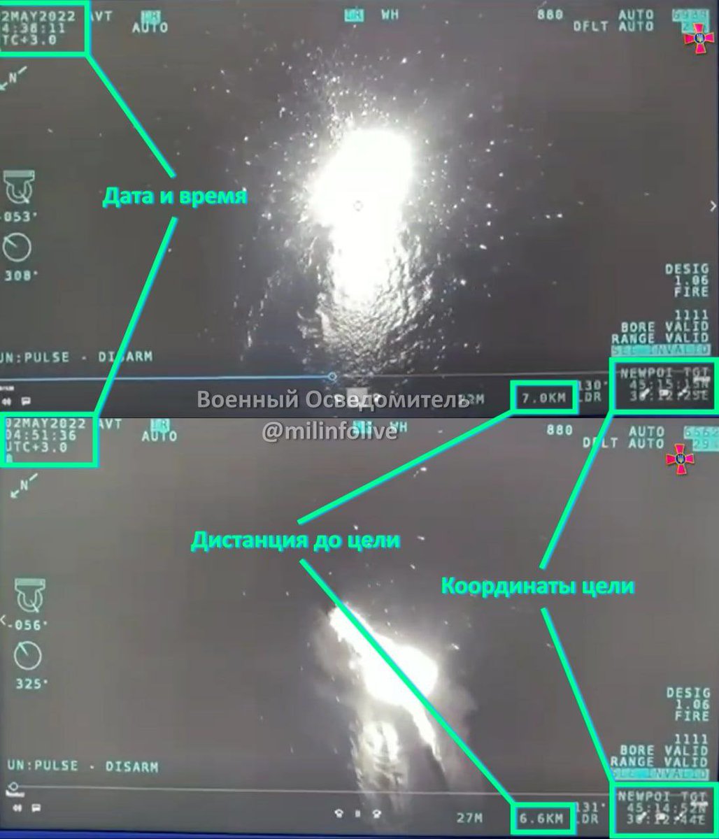 Nach den Daten der Kamera des ukrainischen UAV "Bayraktar TB2" wurden tatsächlich am 2. Mai um 4:38-4:51 Uhr Angriffe auf "Raptors" direkt vor der Küste der Insel Zmeiny aus einer Entfernung von 6,6- 7 Kilometer.