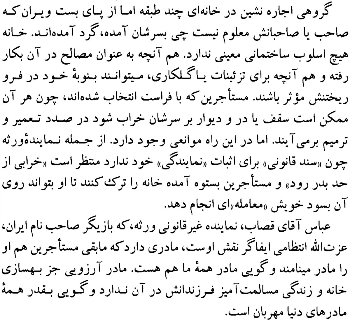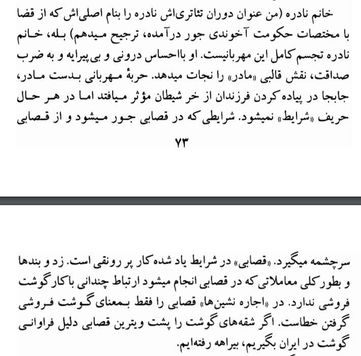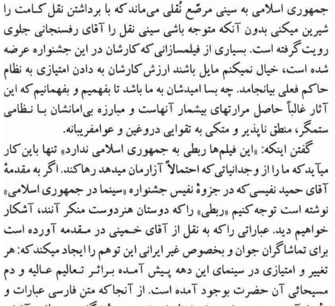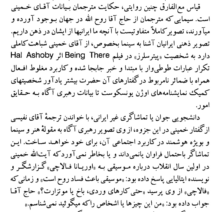 ۲. جمهوری اسلامی ایران پیدا کرد، تامل برانگیز و حالا بسیار دور از ذهن است. فارغ از ارزیابی کیفی این فیلم، یافتن اثری همطراز آن در میزان صراحت، گزندگی و بیپروایی برای توصیف انقلاب ۵۷ به عنوان یک «خودکشی جمعی» و اشاره ضمنی به بازتولید نهاد سلطنت در اشکال دیگر ناممکن است.
