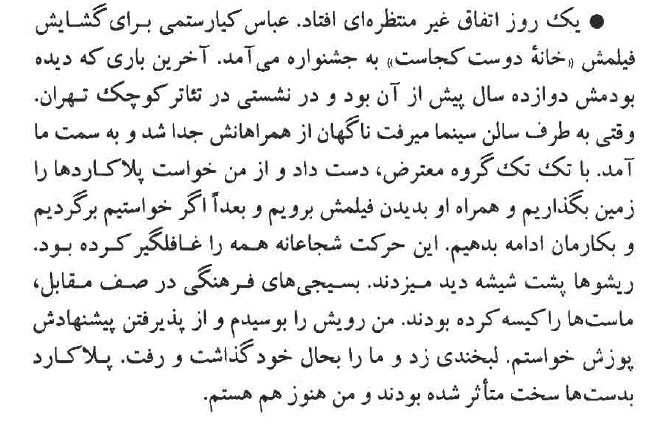 ۱۱. در حاشیه همین اعتراضها بود که عباس کیارستمی و پرویز صیاد برخوردی با هم داشتند و بعدها کیارستمی روایت معروفش را از گرفتن پلاکارد صیاد بیان کرد. شرح آن اتفاق را پرویز صیاد خود چنین در کتابش داده است با احترام و «تاثری» که میگوید هنوز با اوست.