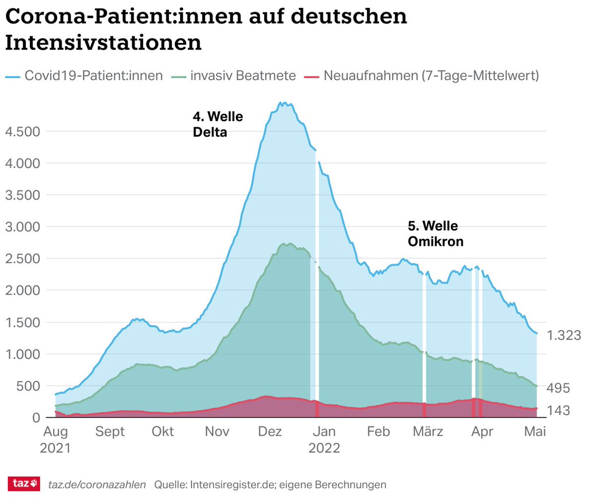 @DIVI_eV Die Zahl der #COVID19-Patient:innen auf Intensivstationen ist heute 17% niedriger als vor 1 Woche und gar 40% niedriger als vor 1 Monat. Das belegt deutlich, dass die 5. Welle der Pandemie deutlich abgeflaut ist. (6/x)
