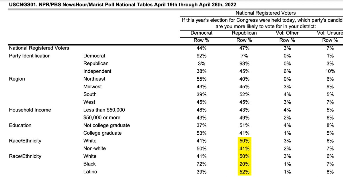 NYT says we're at "a moment when white backlash is the jet fuel of a GOP." A poll just showed 52% of Latinos, 41% of non-whites and 20% of Black people will vote GOP in 2022.