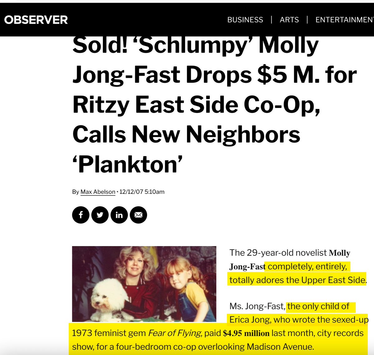 Rich white woman @MollyJongFast - who won the birth lottery by being born to rich famous white parents who raised her in Manhattan, sent her to private schools, and thus herself bought an Upper East Side co-op for $5 million in 2007 at the age of 29 - rants about "rich white men"