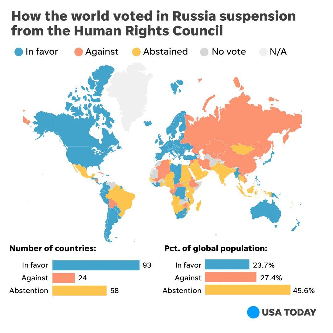 A USA TODAY analysis found that about three-quarters of the world lives in a country that didn't support the U.S.-backed measure suspending Russia from a top human rights group.