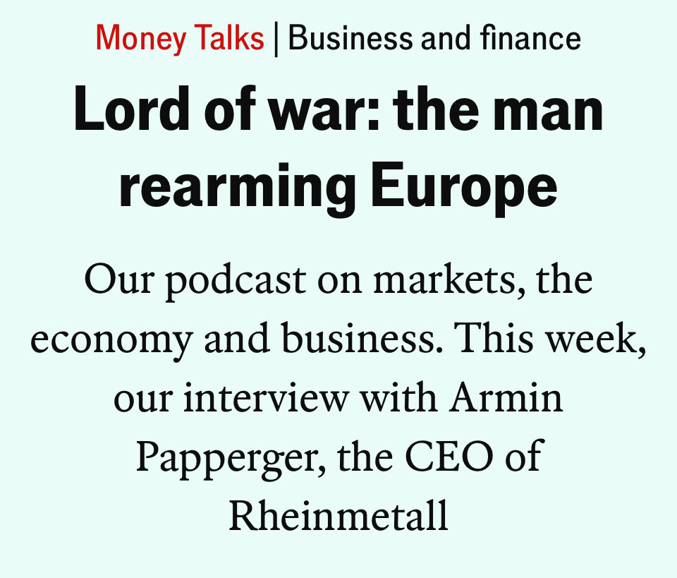 Die militärische Bedrohung und damit die massiven Aufrüstungsprogramme aller westlichen Staaten sind der wichtigste Treiber für den Aufstieg von Rheinmetall und seines Vorstandschefs.“