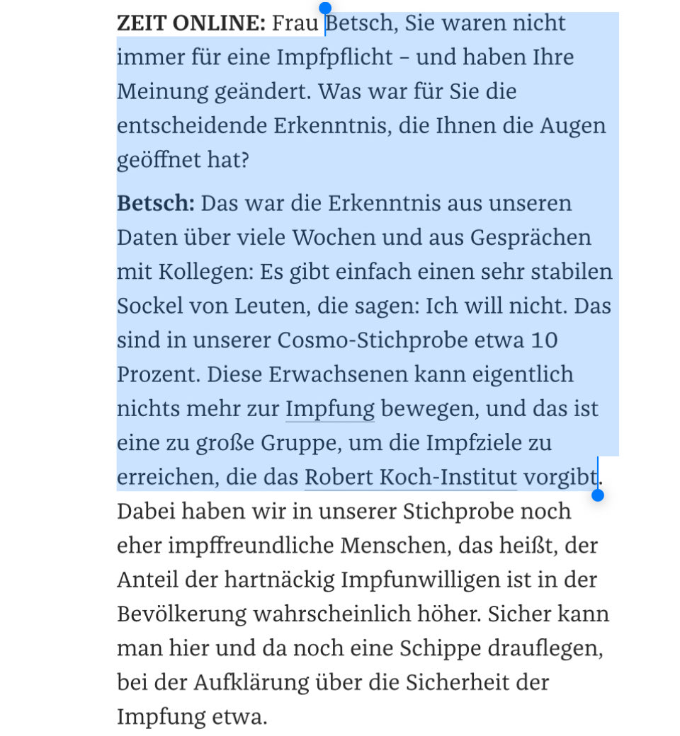 Cornelia Betsch begründete ihren Sinneswandel mit einer (lt. COSMO-Stichprobe) Rate von 10% Erwachsenen, die „nichts mehr zur Impfung bewegen“ könne, „und das ist eine zu große Gruppe, um die Impfziele zu erreichen, die das RKI vorgibt.“