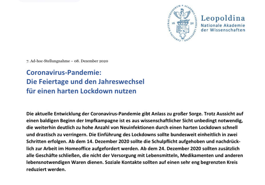 3/ Cornelia Betsch war im Übrigen auch Mitunterzeichnerin der 7. Ad-hoc-Stellungnahme der LEOPOLDINA, in der vehement ein „harter Lockdown“ über den Jahreswechsel 2020/21 gefordert worden war: