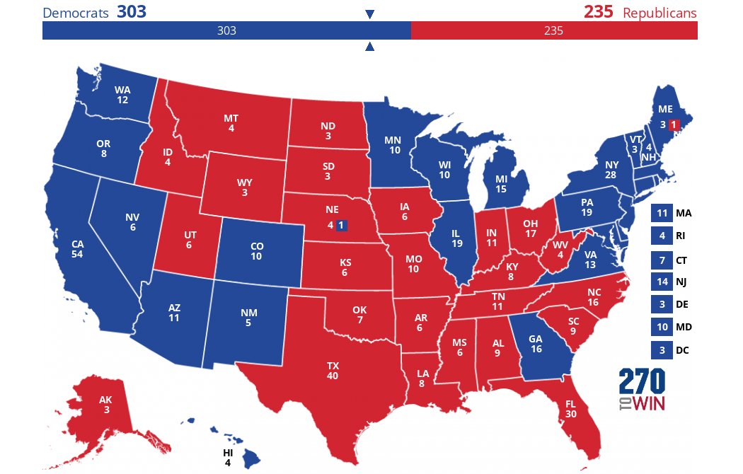 Ése era un resultado peor de lo que parecía, porque las elecciones en Estados Unidos no las gana quién obtiene más votos de la ciudadanía, sino en el Colegio Electoral, y en éste, los republicanos tienen ventaja, dado que ganan en más Estados con pocos habitantes. 3/