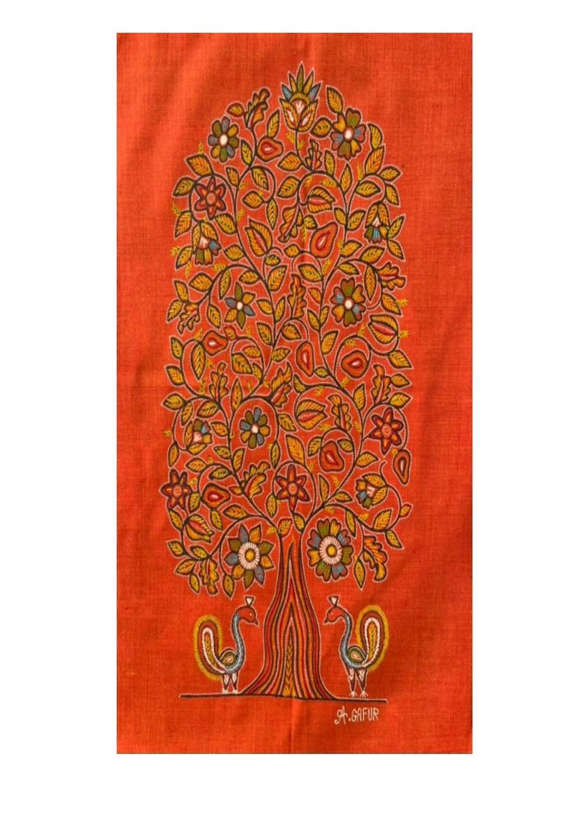 The process of making Rogan painting is very laborious and skillful. Artists place a small amount of this paint paste into their palms. At room temperature, the paint is carefully twisted into motifs and images using a metal rod that never comes in contact with the fabric.