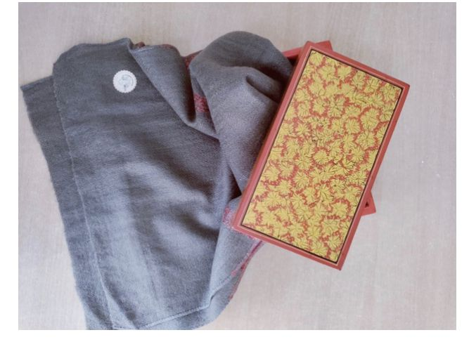 The Pashmina stole is packed in a Kashmir Papier Mache box which is handcrafted & coloured. The piece is hand-painted in a floral design depicting flora and fauna of Kashmir valley. The design used in this piece is intricate pattern drawn with fine thin brush.