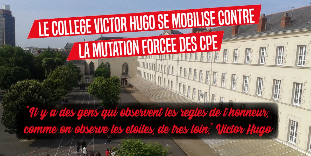 Soutenez les équipes éducatives de vos bahuts, soutenez les CPE de Victor Hugo : le collège sera en grève jeudi 5 mai pour alerter le rectorat et annuler la mutation forcée !