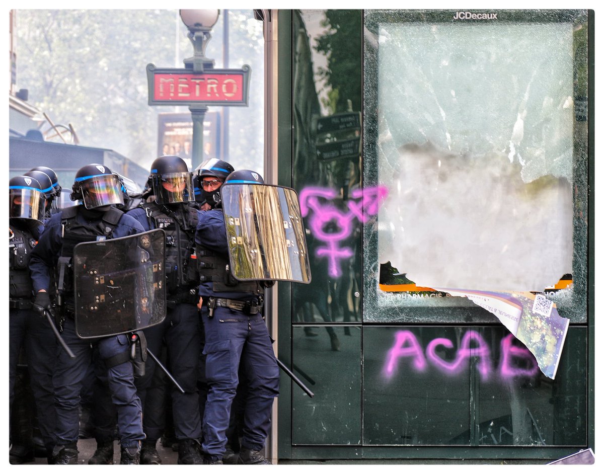 Beaucoup de banderoles, de détournements de publicités, de tags. Plusieurs barricades. Des Gilets Jaunes, des kways noirs et des chasubles syndicales. Une cinquantaine de personnes ont été arrêtées.