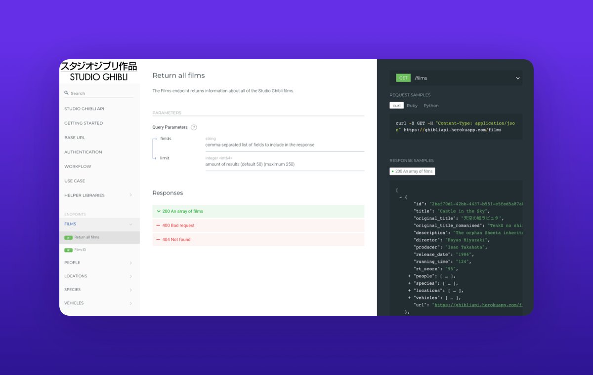 La API de Studio Ghibli cataloga a los personajes, lugares y cosas de los mundos creados por Ghibli. Si quieres crear tu propio track de películas Ghibli esta es tu API.