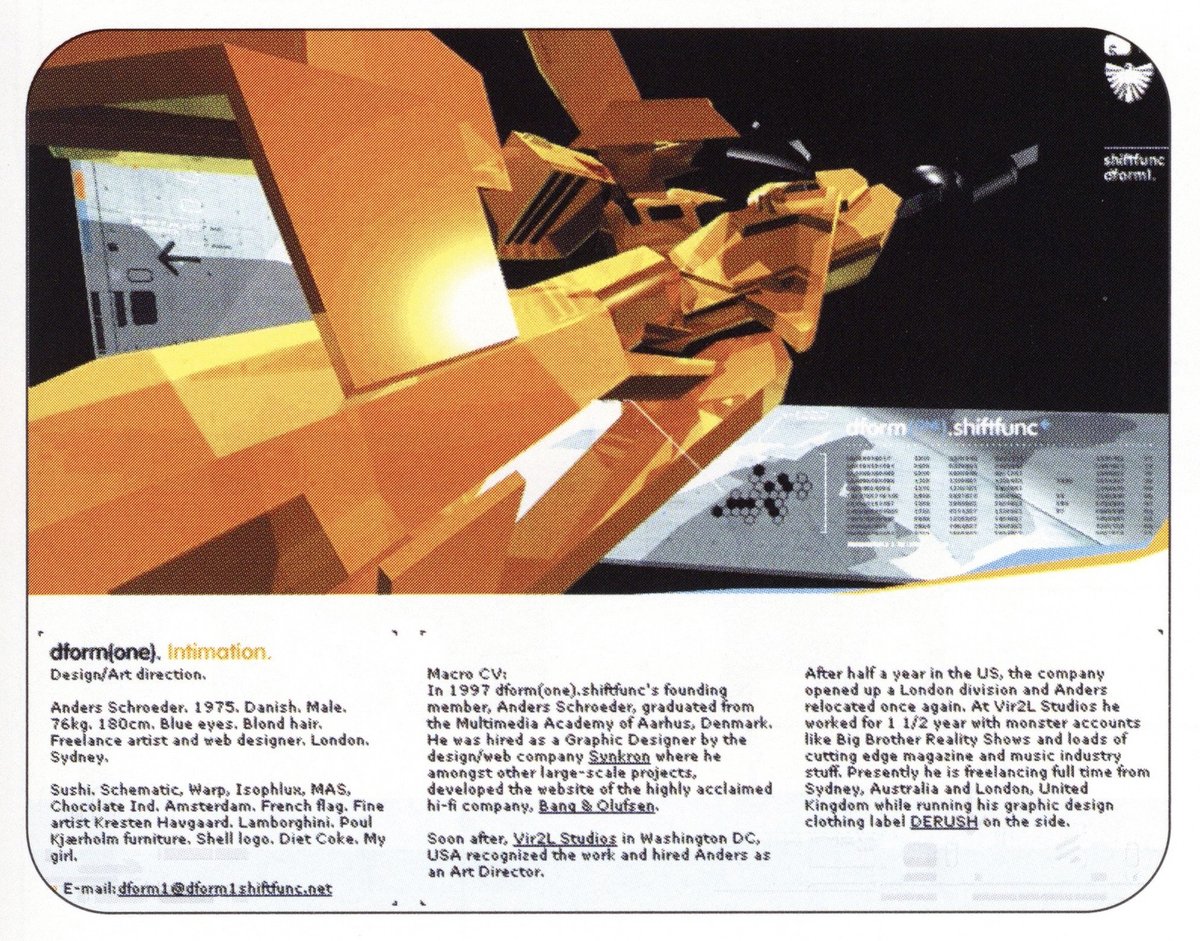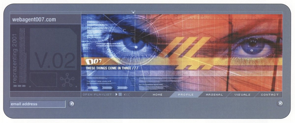 I love the dense layering and various PS effects; it's mainly in the 'Metalheart' style pioneered by design firms like the Attik. Unfortunately it seems that only the splash page is preserved on the Internet Archive.