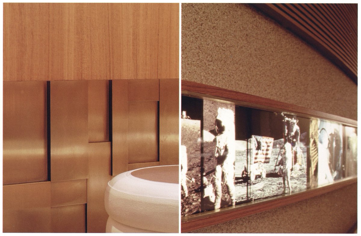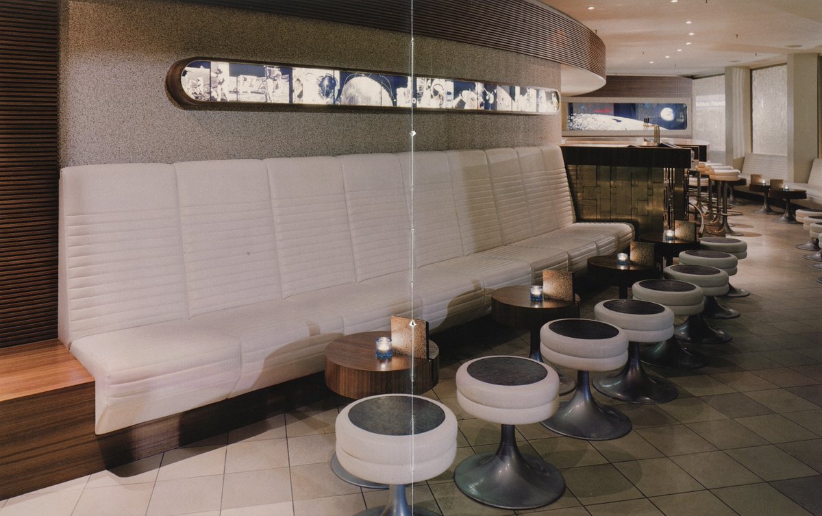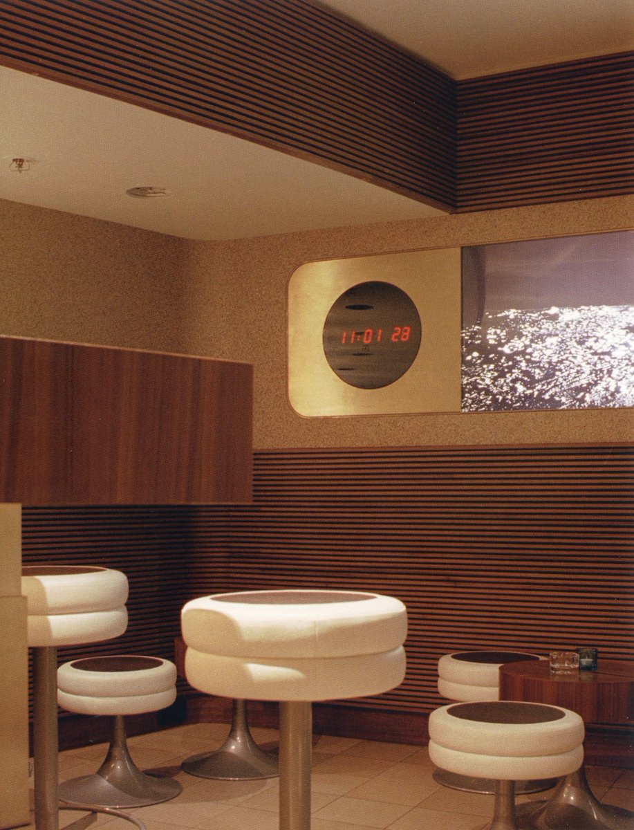 The Universum Lounge in Berlin is great example of the revival of 1960s-70s Ultramodern space age styles. Love the use of period space imagery in the 'window', and the sleek wood banding.