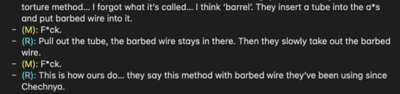 Full transcript of that call where the #Russian soldier tells his (approving) mother about the tortures being inflicted on #Ukrainians, including this particularly grisly example