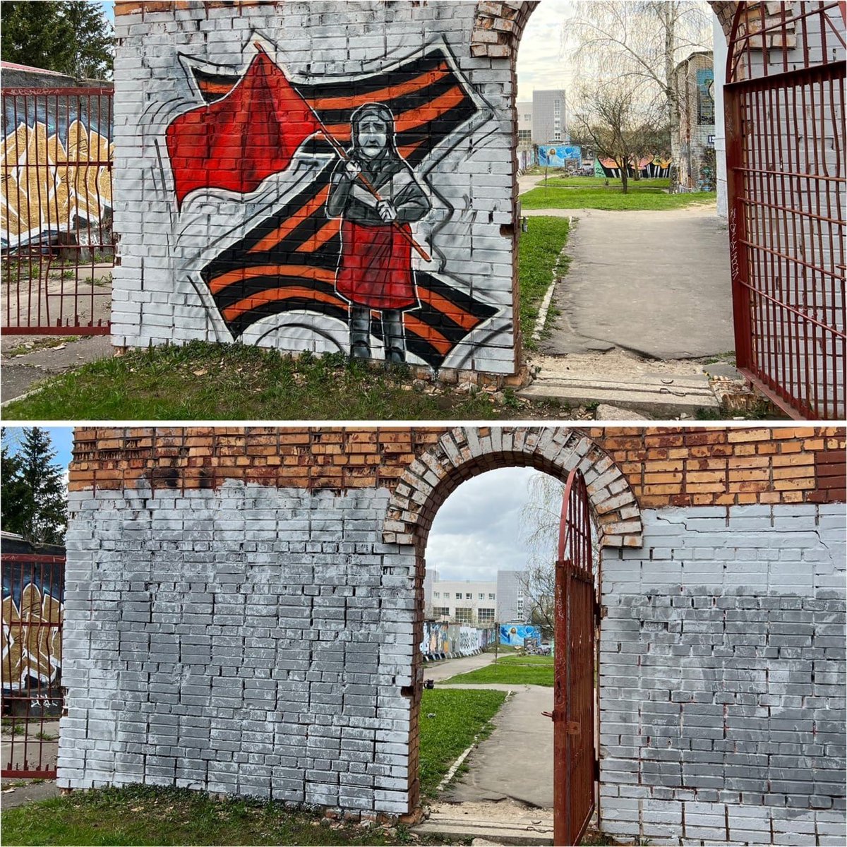 #Russia: In Obninsk, pro-regime graffiti of the "old woman with a red banner" appeared, but it did not last even a day: during the night, activists opposed to Putin's war against Ukraine painted over it.