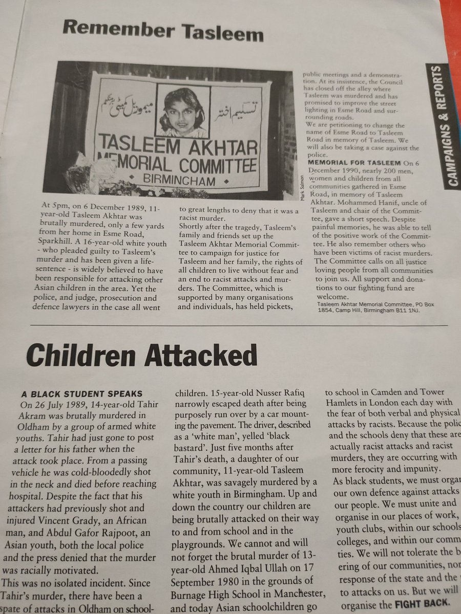 I was looking at some old issues of CARF Magazine and came across these truly heartbreaking stories. 11-year-old Tasleem Akhtar from Birmingham and 14-year-old Tahir Akram from Oldham murdered in 1989.