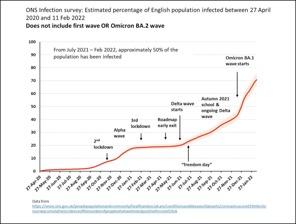 A: Recent estimates suggest around 58% of the population in the US and over 70% in England have been previously infected, with BIG increases during the Omicron wave.