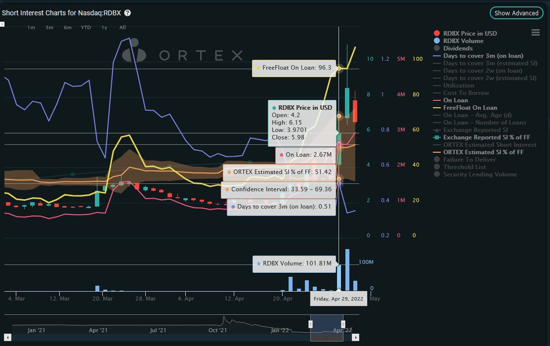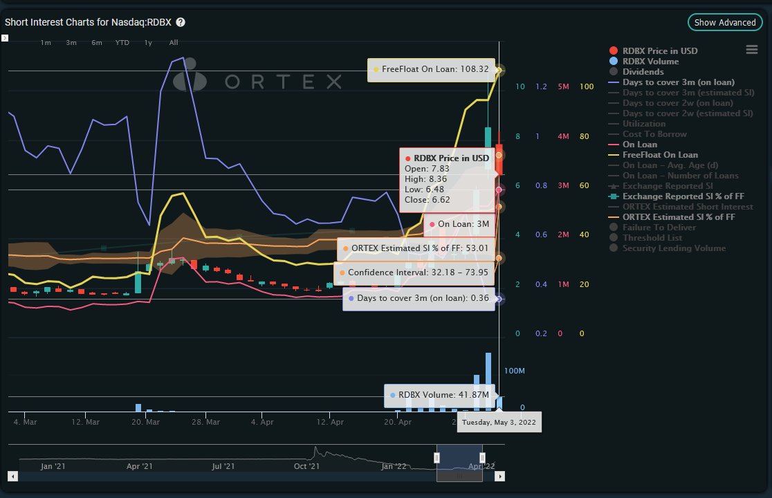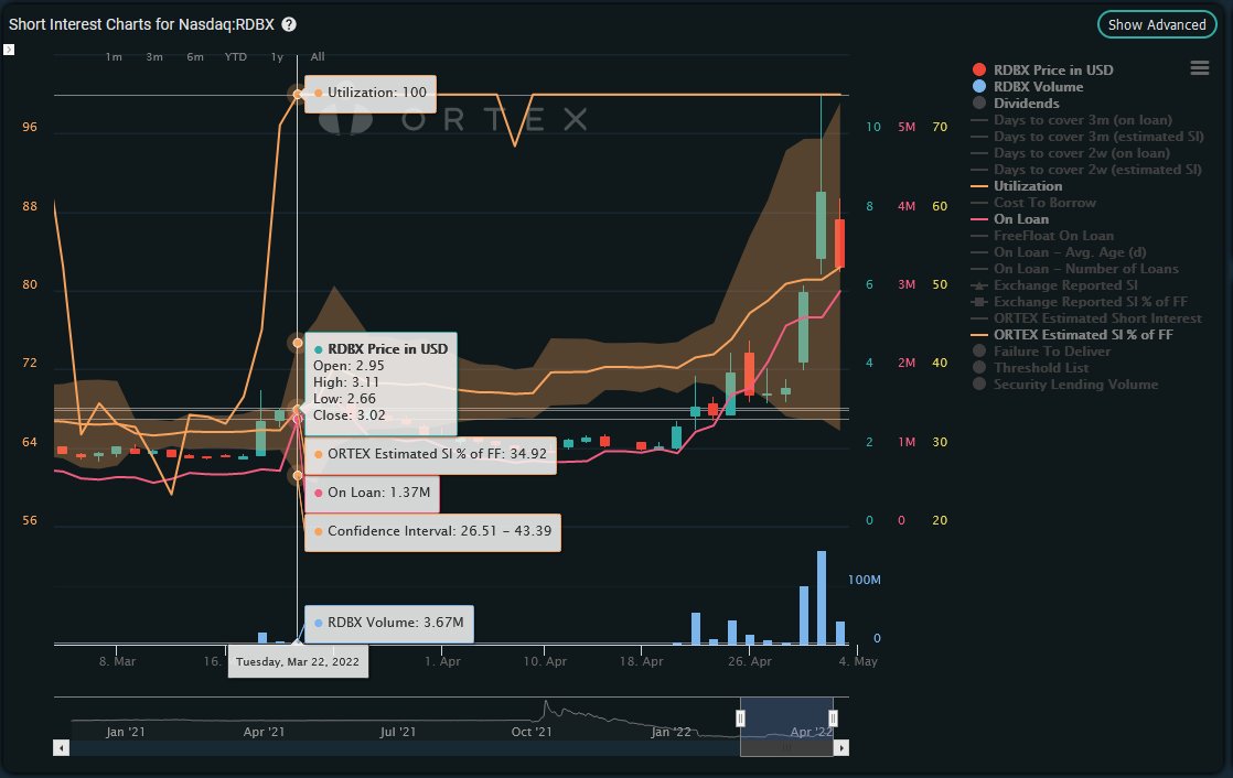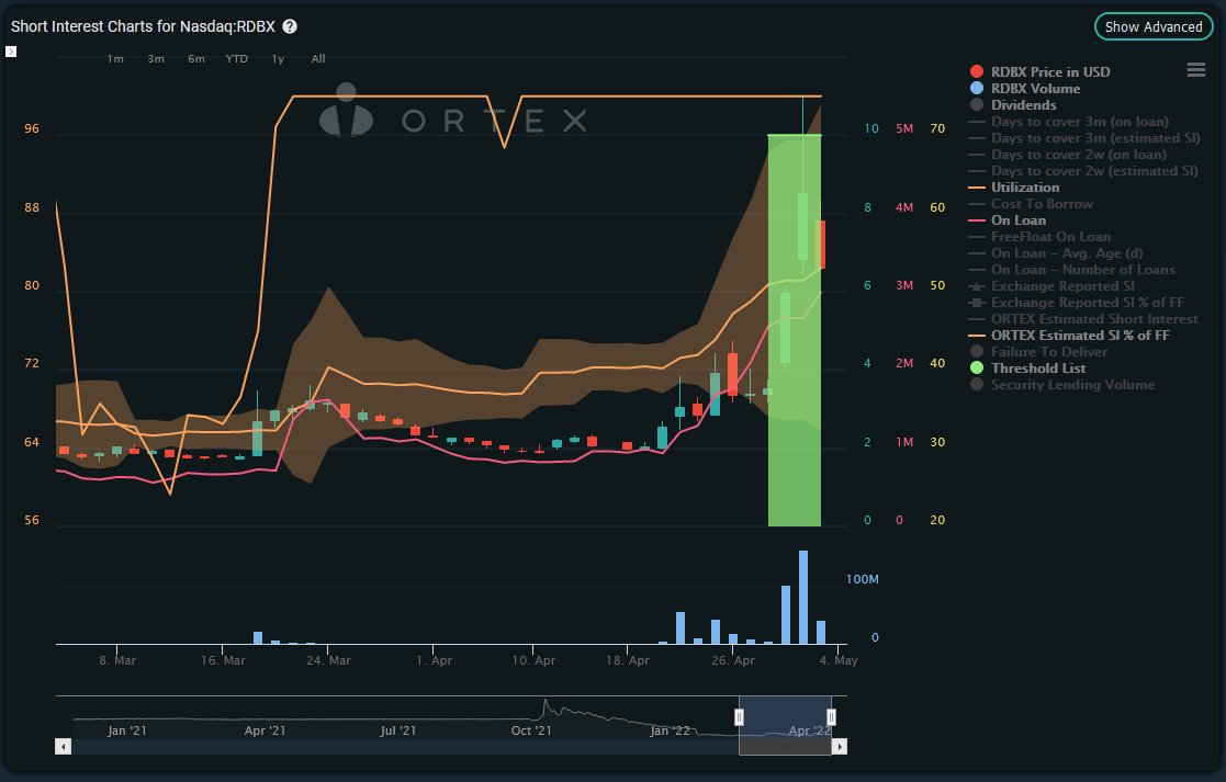 Let's look at another factor. $RDBX lendable shares have been 100% utilized since Mar 22, and on threshold ever since Apr 28.