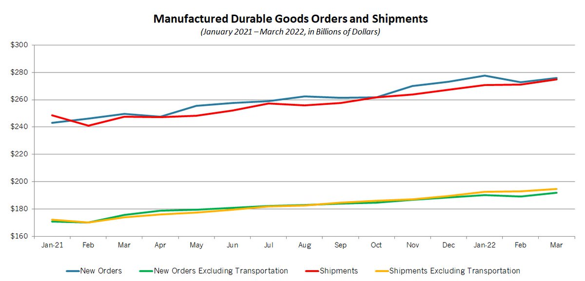 Overall, transportation equipment orders rose by 0.4%. Excluding transportation equipment, manufacturing orders jumped 2.5% from $462.0 billion in February to a record $473.4 billion in March, with durable goods orders excluding transportation up 1.4% for the month.