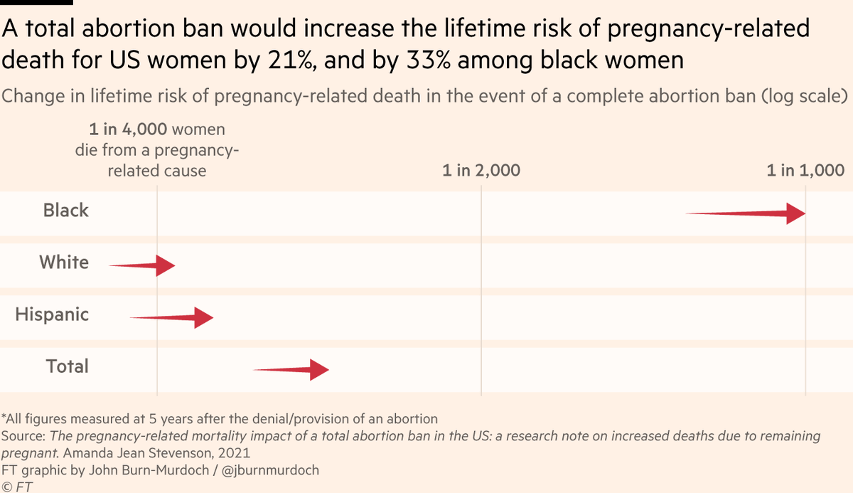 The result, as demonstrated by @ajeanstevenson, is that a US abortion ban would increase the lifetime risk of a black woman dying from pregnancy-related causes by 33%, to 1 in 1,000 read.dukeupress.edu/demography/art…