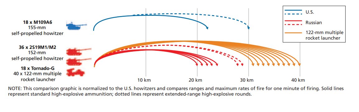 Remember what we said about planning for a war where you may not have control of the air. That means Russian ground forces need to be able to dish out massive punishment on their own. Russian army units have both a higher concentration of artillery, and longer ranges. (6/N)