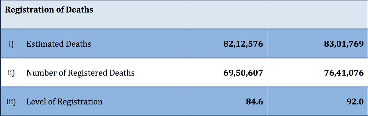One of the key features of CRS reports is level of registration of deaths in the country. This gives you the number of deaths registered for every 100 that actually died. The 2020 CRS report is missing this crucial info. Here's the level of registration seen in 2019: