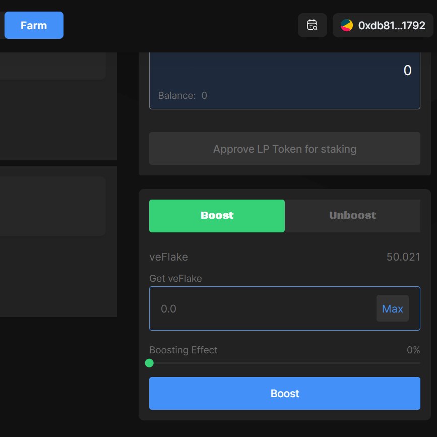 Farm kısmında flake stake ettiğinizde veFLAKE olarak token veriliyor ve onları farm havuzlarına boost yapabilirsiniz. Unboostta yapalım.