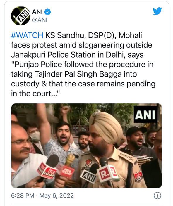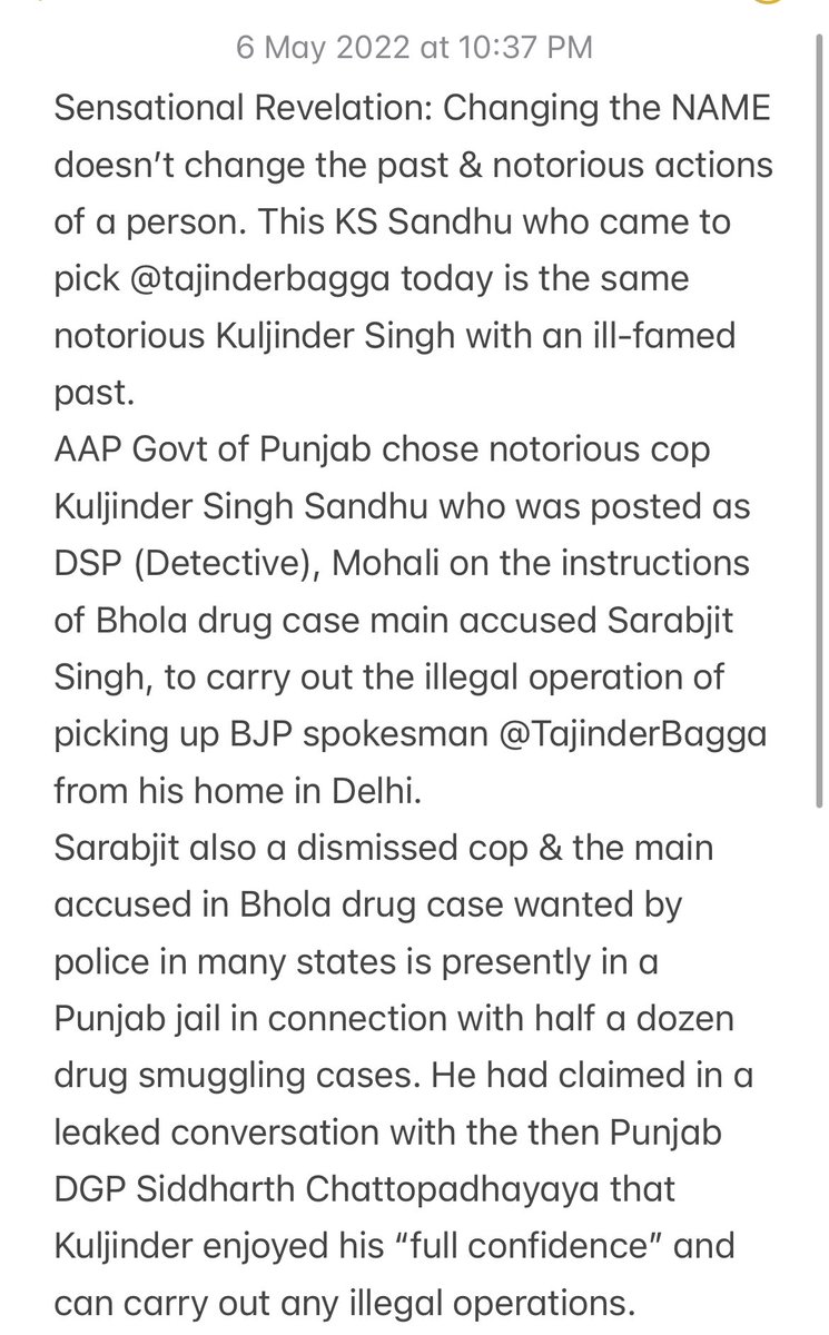 •@AAPPunjab Govt chose notorious cop Kuljinder Singh Sandhu who was posted as DSP (Detective), Mohali on the instructions of Bhola drug case main accused Sarabjit Singh, to carry out illegal operation of picking up BJP spokesman @TajinderBagga from his home in Delhi.