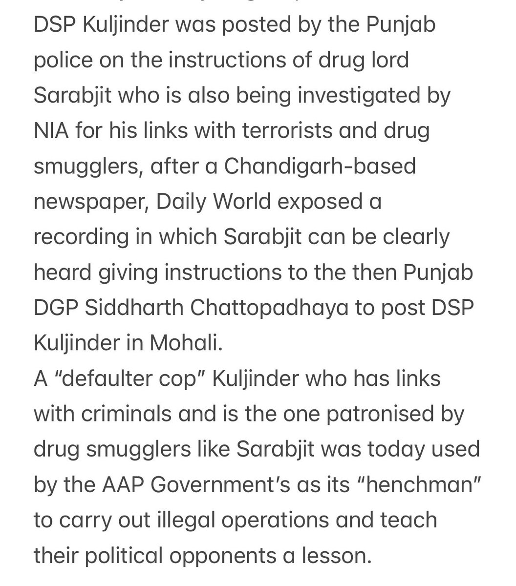 DSP Kuljinder was posted by @PunjabPoliceInd on the instructions of drug lord Sarabjit who is also being investigated by NIA for his links with terrorists and drug smugglers, after a Chd-based newspaper, Daily World exposed a recording in which Sarabjit can be clearly heard 5/n
