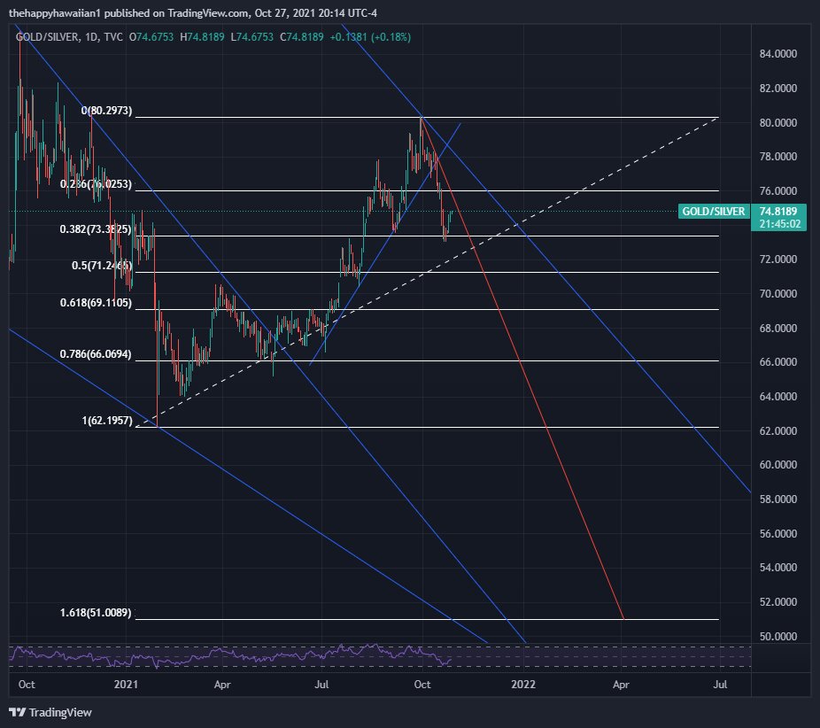 And if we look at the Gold / #Silver ratio, plotted with fib levels, you can see the red trendline would get us to the 1.618 extension in late Q1 2022, or a 51 GSR