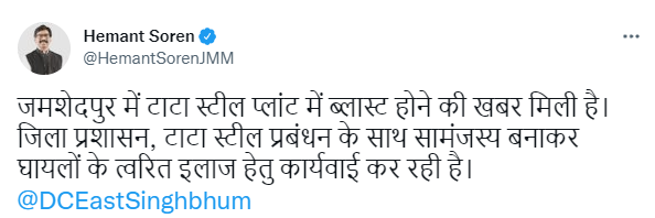 Blast and fire at Tata Steel factory | Jharkhand CM Hemant Soren tweets that Jamshedpur district administration is working in coordination with Tata Steel management for the immediate medical treatment of the injured.