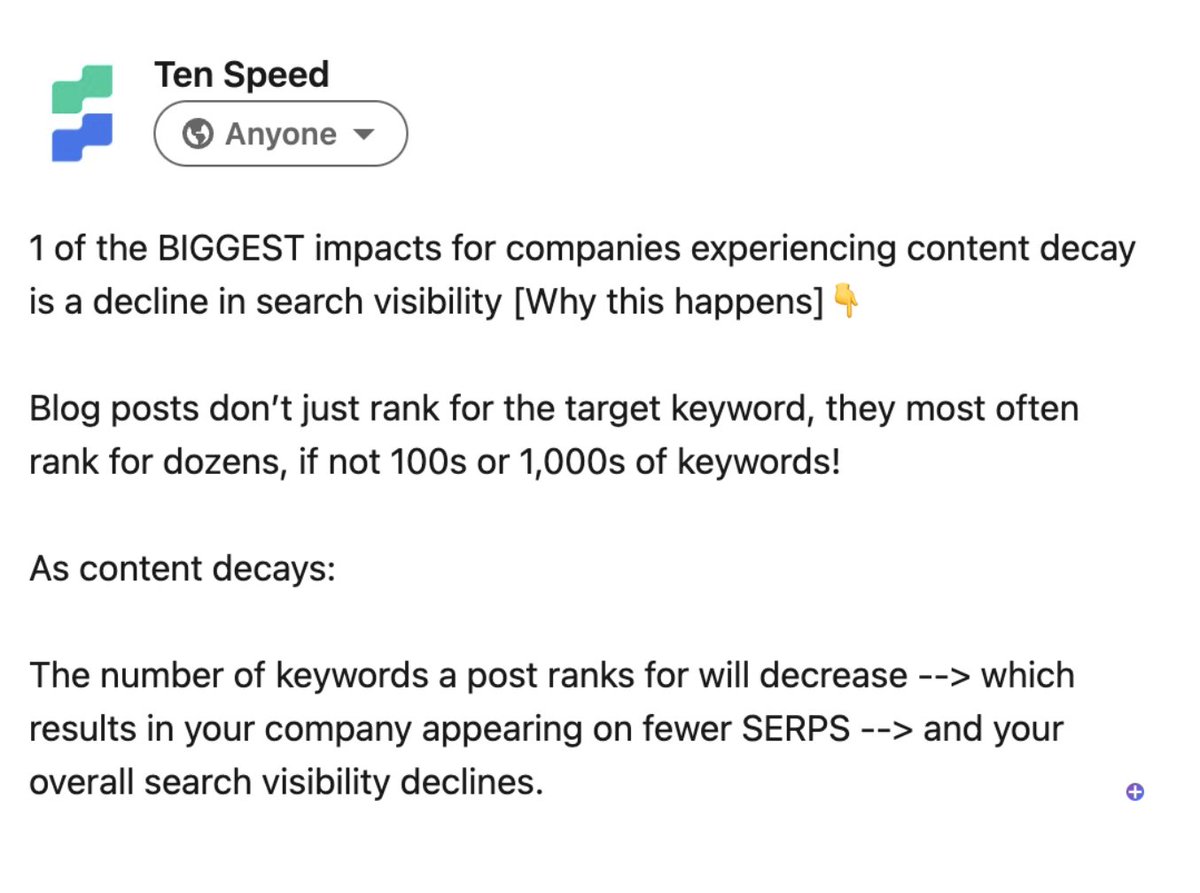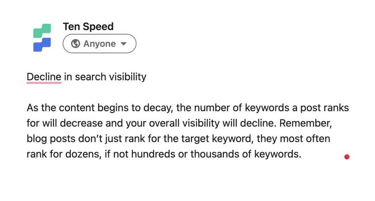 The header, “Decline in search visibility,” is a part of a list of ways in which content decay can impact organic traffic and SEO results.