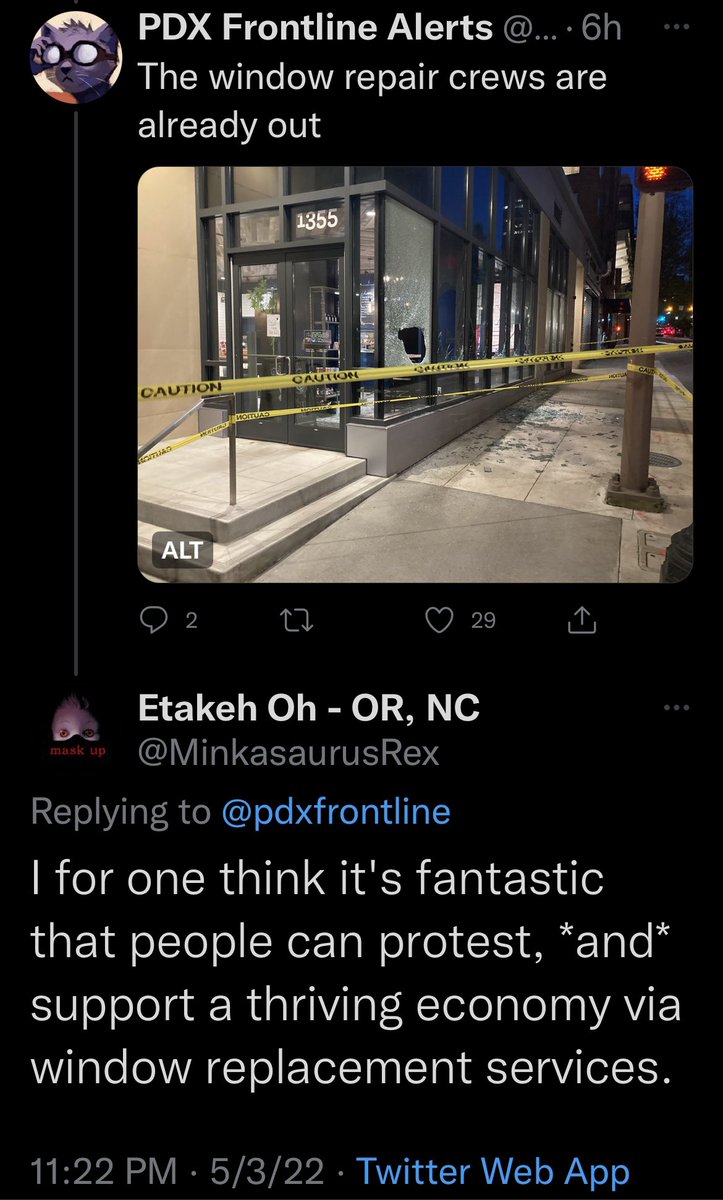 As organized & pre-announced on Twitter, #Antifa destroyed property & started fires in Portland last night at their pro-abortion direct action riot. Like a gang, they talk now about discarding the clothes they wore while carrying out the crimes together.