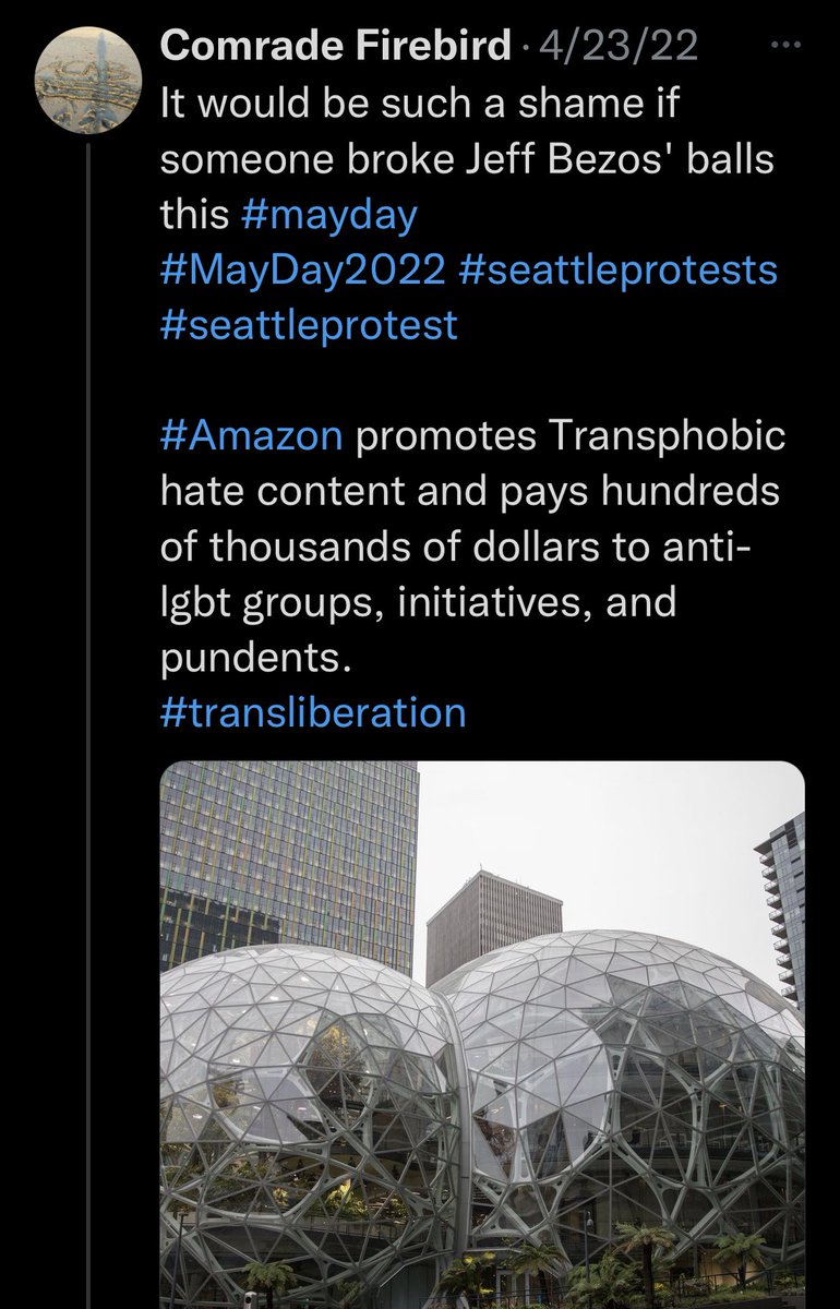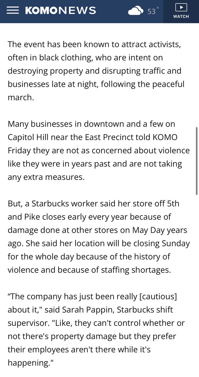 The Seattle May Day events are infamous for violence. Starbucks is closing its 5th & Pike Street location in order to protect staff. #Antifa are also calling for violence against @amazon.