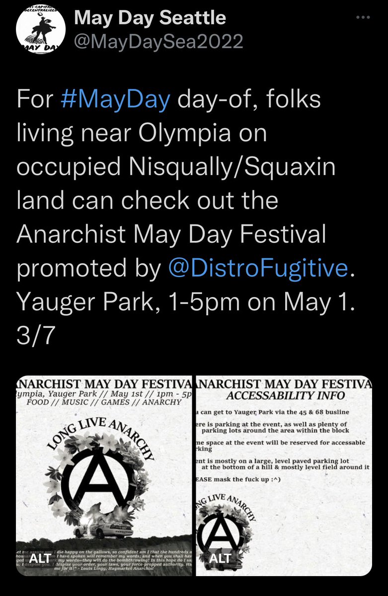 Olympia, Wash.: #Antifa have organized a May Day event at Yauger Park at 1 pm. The Antifa cell in the state capital is extremely violent. Last year, one of its members, Benjamin Varela, was arrested & charged over a shooting. nypost.com/2021/09/27/ant…