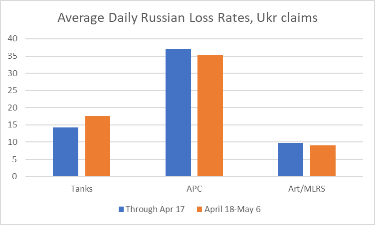 In the case of tanks, even higher, raising from 14.3 before April 18 to 17.6 afterwards, a signifcant 25% increase in losses claimed from what would have to be a smaller force. Again, if these are indicators of combat intensity, such a pace cant be maintained for long.