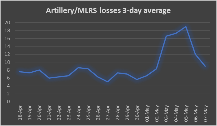 3) After May 1, seems that the combat effort by the Ukrainians moved to employ ranged weapons to take out Russian ranged weapons. 4) Overall, this battle cant last much longer. These loss claims, even if reduced by one third, are not sustainable. The APC losses are also extreme.