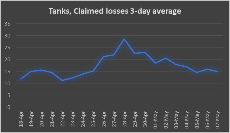 In tank claims (now expressed in rolling 3-day averages with the date indicated the last day of the calculation, there was a very large increase in claimed losses up until 28 April and a steady decline since. Looks like extreme armor losses from April 25-30