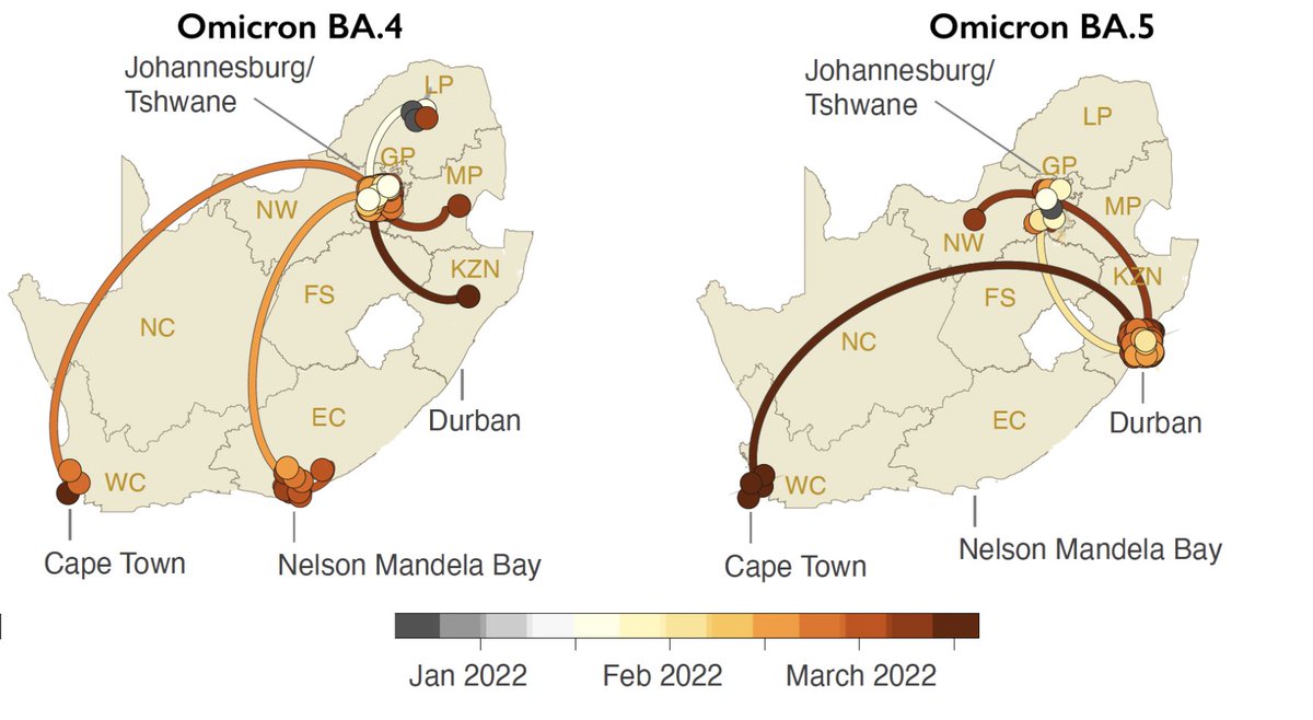 BA.4 dominates infections in Gauteng and spreads to other provinces. BA.5 also started in Gauteng but moved to dominate infections in KZN. Again, It does NOT mean that these lineages are from South Africa, they were ONLY detected in SA due to good genomics surveillance.