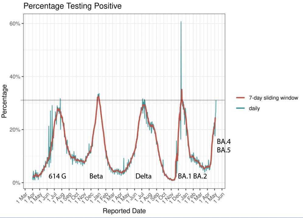 The multiple variants and lineages of Omicron fulled 5 waves of infections. With decreasing qPCR testing in South Africa and the world, test positivity ratio or other proxy markers may be better than infections to identify waves of infections